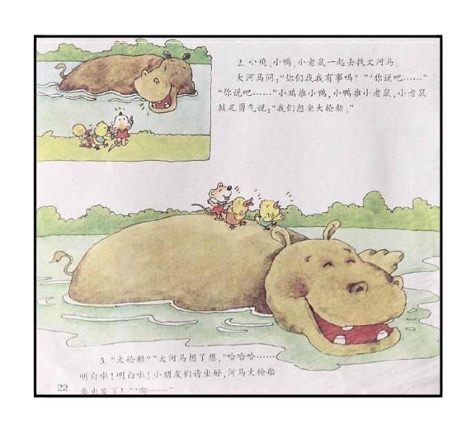 【教学内容】语言:河马大轮船 来源: 发布时间:2023-06-16 10:30:14 浏览次数: 次 【字体:小 大】 活动目标:1.熟悉童话中的主要对话,学习短语:“大河马,**大得不得了!”2.理解 作品中的故事情节和人物形象,了解基本的看书方法。3.感受朋友之间互相帮助的温馨、美好的情感。