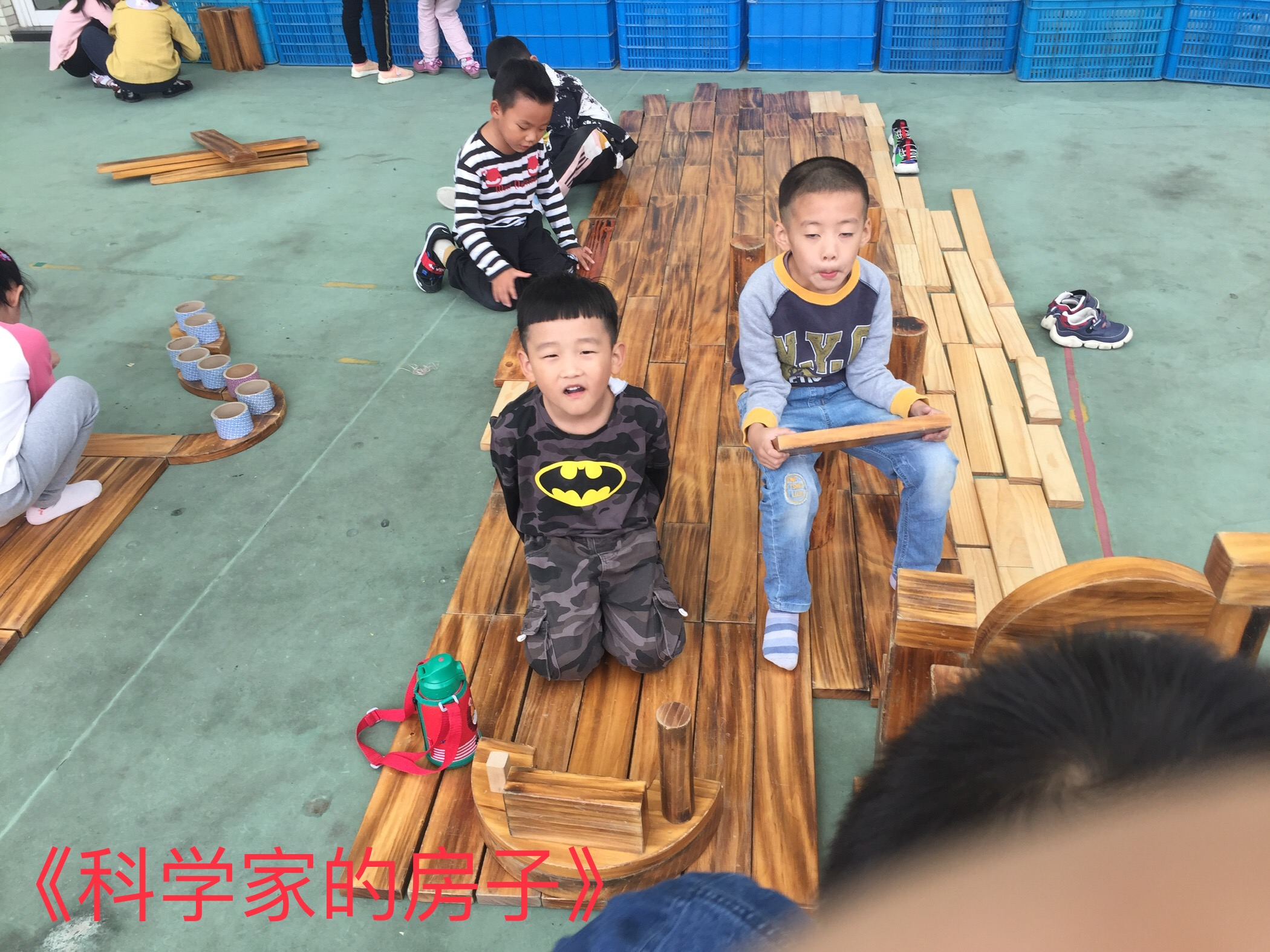 今天邓子房和舒敬菡他们一起玩积木。他们搬了很多的长条积木平铺在了地上。我走过去问他们:“你们搭的是什么?”邓子房说:“我们搭了一个科学家的房子。”舒敬菡也跑了过来介绍。他一边指着一边说:“这个是他们吃饭的地方;这里是他们睡觉的地方;还有这里是他们的操作台,可以操控的;旁边是丁驿他们搭的,是和我们连起来的。”丁驿告诉我说:“我们搭的是一个玩具监狱。”为他们的想象力点赞!