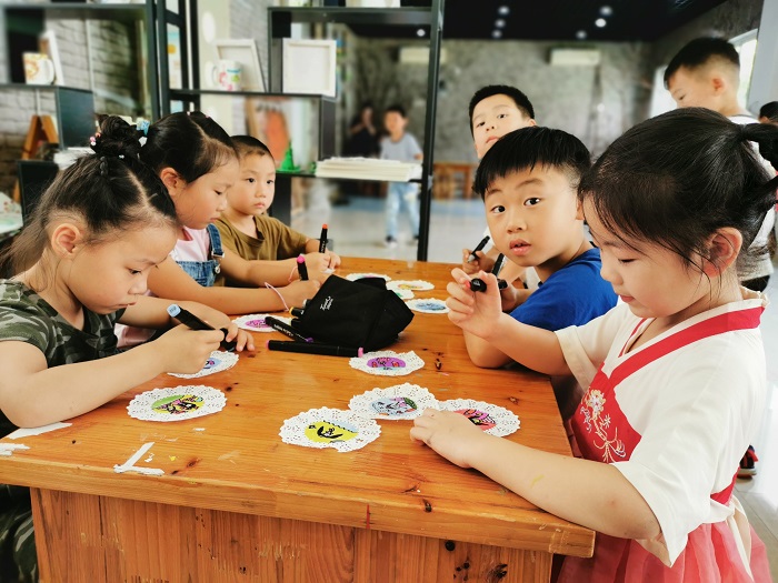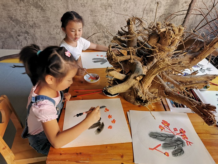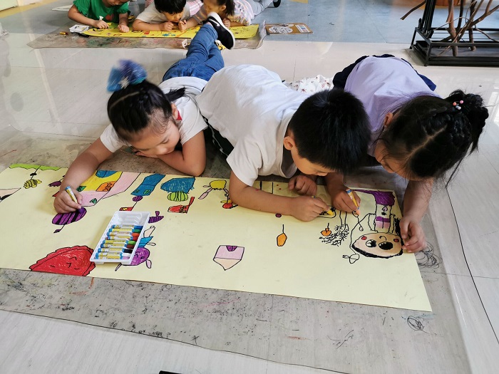 孩子们按照自己的意图创作,给想象插上了翅膀,让孩子们的新学期嗨起来。转角遇到创意,一棵古老的树根在桌上静静地站着。孩子们找来了毛笔,在自然的意境中泼洒国学水墨,完成作品后把笔挂在树上成了一棵棵笔树。一起把收集来的纸盆等合作创作成各类作品,挂在艺术树上展示,用合作的精神一起放飞梦想和创作长卷画。丙烯画让孩子们俨然是一副小画家的范儿,在动手实践中,能玩转新的事物,走向无痕融合。让创意室增加了灵气,更加充满活力。
