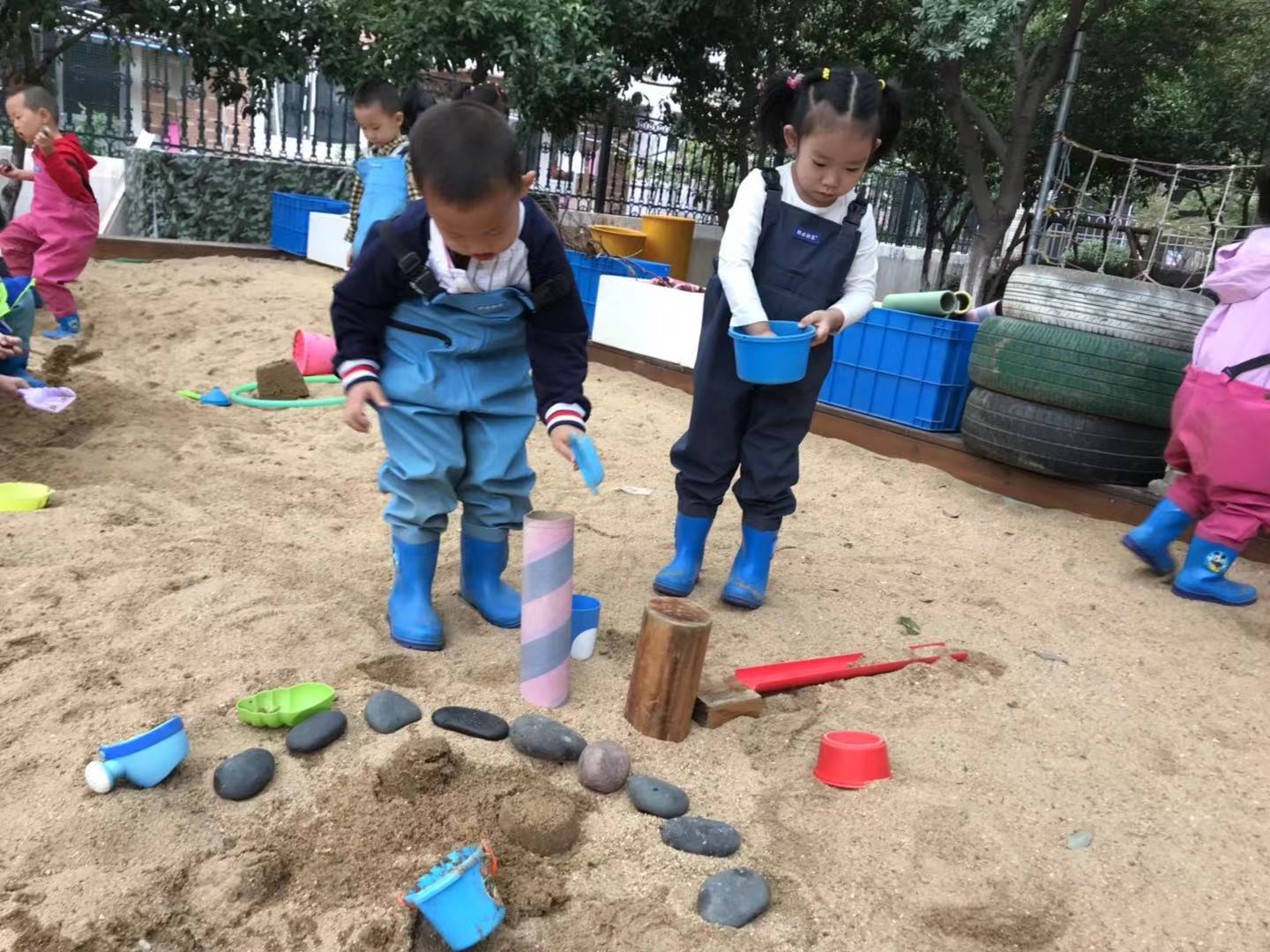 玩沙是孩子们的天性,也是他们最最感兴趣的。瞧,希宝和闵俊人在老师的游戏开始声中,找到了小桶和铲子来到了他们的秘密基地。闵俊人说:“希宝,我们来给公主造城堡吧!”希宝说:“好的。”希宝去水池边等来水,闵俊人去材料区拿来了很多的石头。希宝问:“你要石头干什么?”闵俊人说:“我先把地方圈出来,这样别人就不会踩到我们的城堡啦!”闵俊人和希宝一起吧石头围城了一个圈,希宝在边上开始装湿沙,不一会,小小的城堡就做好啦!希宝说:“闵俊人,公主的城堡做好啦!”闵俊人说:“我来给她们做个桥。”他又去材料去拿来了红色管子,希宝说:“这就是小桥吗?”闵俊人说:“对呀。”我们的城堡做好啦!