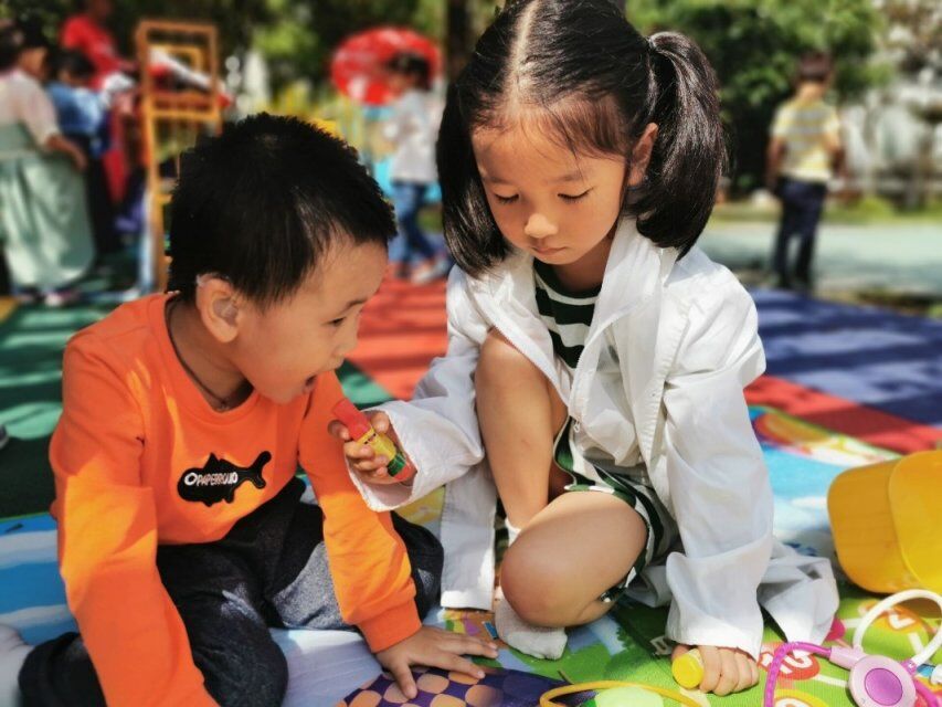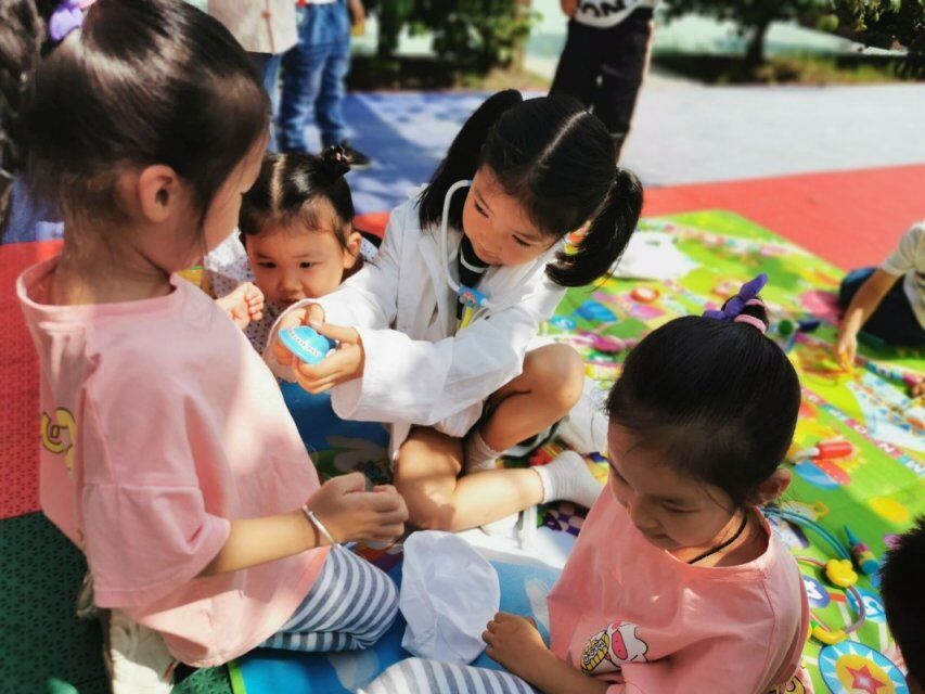 宝仪来到小医院,先把帽子摘下来换上医生的帽子,然后拿起“香皂”假装洗手,接着就开始拿起注射器对着自己的手指假装打针,这是左左也来了,换上帽子后又让朱程熠帮他穿上白大褂,穿戴整齐后,从橱子里拿出吊瓶挂到挂钩上,然后又把小药箱拿出来,两人玩起了里面的材料,朱程熠假装成病人,捂着肚子一边“哎呦、哎呦……我的肚子好疼啊”一边走进了小医院,两个小医生看了看朱程熠,不知所措,朱程熠又说:“可能是我昨天晚上喝了凉的饮料了,医生快给我看看啊。”宝仪指着小凳子说,“坐下”朱程熠坐下后,两个小医生还是不知所措的样子,朱程熠说“医生啊,我要不要吃点药啊?”宝仪想了想从药柜子上拿起一盒药递给朱程熠,然后又玩起了材料……