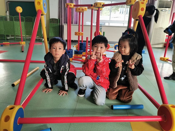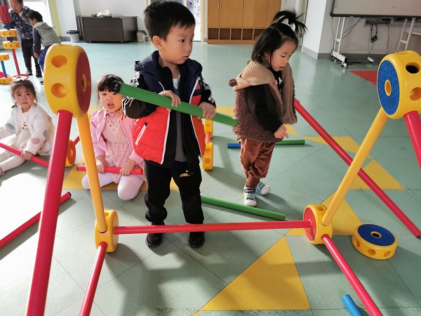 许诺和缪卓言通过商量选择了火车,先寻找火车需要的材料。但在拼装的过程中发现了问题——轮胎总是拼不结实。许诺先用两个黄色“轮胎”连接在一根蓝色的支杆上,缪卓言帮忙扶着,继续连接一个支杆和一个轮胎,但没有成功。缪卓言发现可以先各自拼好两个黄支杆的组合,再进行组装。许诺又发现连接点要统一对准插孔,用力一挤,成功了。两人通过协商达成先拼车厢的共识,缪卓言主拼,许诺帮忙,他会在缪卓言拼装后用力加固,缪卓言反复拼搭最终还是散架了。他看了看我,好像在寻求帮助。我用鼓励的眼神看着他,刚想引导时,许诺走过来帮忙,缪卓言说“你重新做,我给你找轮子”。他开始用力的拼装,缪卓言帮忙准备了十几个黄色的轮子与蓝色的支杆。角色互换了,许诺主拼,缪卓言帮忙。我询问:“需要加一张桌子吗?”我帮他们扩展了探究场地,两个孩子重新研究。许诺说:“咱们做个坦克吧,多神奇呀。”缪卓言坚定的说:“咱们先做火车,火车做完了,再做坦克。”“太难了!”“不难!”我连忙说:“只有每一次都拼插结实,才会牢固。”两个孩子恍然大悟,兴奋地再次进行探索,最终拼装了一节完整的车厢。